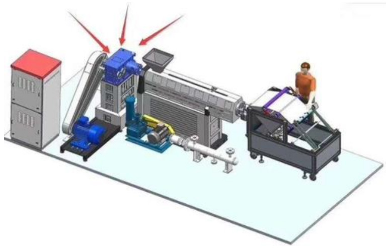 自動(dòng)上料機(jī)自動(dòng)吸入拉絲級(jí)聚丙稀送至擠出機(jī),擠出機(jī)加熱熔化PP顆粒至液態(tài)。羅茨鼓風(fēng)機(jī)或空壓機(jī)和儲(chǔ)氣罐壓縮空氣送至烘箱加熱,熱空氣通過壓力使熔化成液態(tài)的聚丙烯材料從噴頭噴射而出形成絲狀物(噴頭內(nèi)含數(shù)以百計(jì)的小孔)后,噴出的絲狀物水平到達(dá)接收設(shè)備,然后用滾壓機(jī)軋制無紡布。