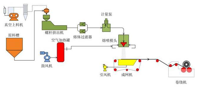 自動(dòng)上料機(jī)自動(dòng)吸入拉絲級(jí)聚丙稀送至擠出機(jī),擠出機(jī)加熱熔化PP顆粒至液態(tài)。羅茨鼓風(fēng)機(jī)或空壓機(jī)和儲(chǔ)氣罐壓縮空氣送至烘箱加熱,熱空氣通過壓力使熔化成液態(tài)的聚丙烯材料從噴頭噴射而出形成絲狀物(噴頭內(nèi)含數(shù)以百計(jì)的小孔)后,噴出的絲狀物水平到達(dá)接收設(shè)備,然后用滾壓機(jī)軋制無紡布。